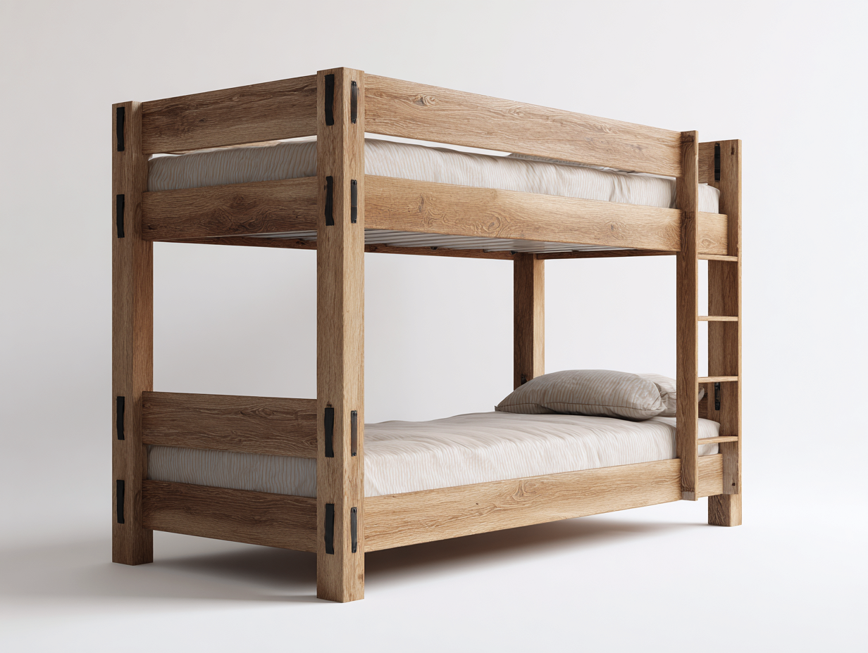 Esta litera de diseño rústico combina funcionalidad y estética natural, siendo una opción ideal para dormitorios compartidos o espacios donde se requiere optimizar el área disponible. Su estructura robusta aporta estabilidad y un estilo cálido que se integra fácilmente en distintos entornos.